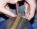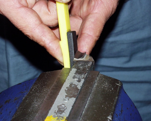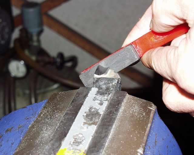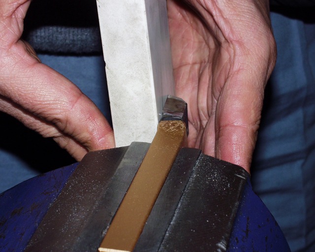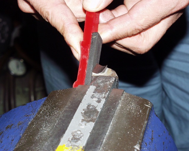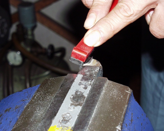 ハンドラッパーの赤(#180)を用い、逃げ面に対し横向きにハンドラッパーを当てます。面に沿って前後(左右)に砥石を動かします。横逃げ面から前逃 げ面まで連続的にハンドラッパーを当ててこすっていくとノーズ半径を形成することが出来ます。#180は荒いのでノーズ半径が必要以上に大きくならないよ うに注します。