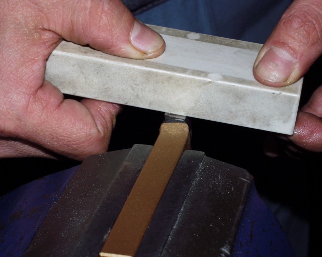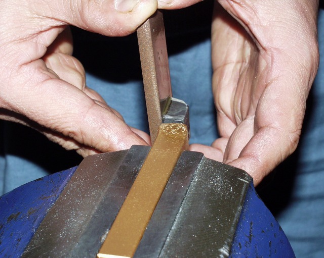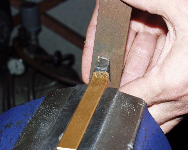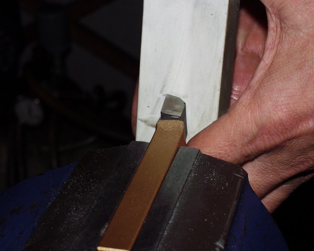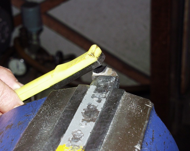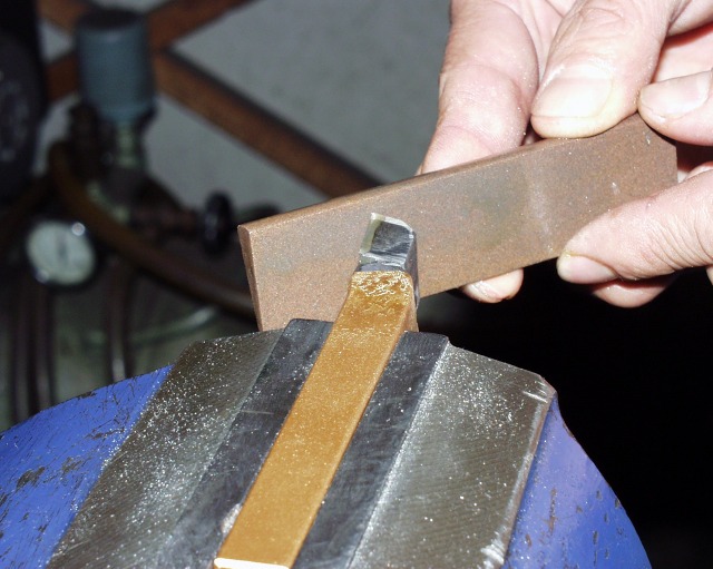 焼成砥石(#600〜800)を用いて、最初に逃げ面、次に軽くすくい面、そしてノーズ半径という順に研ぎます。